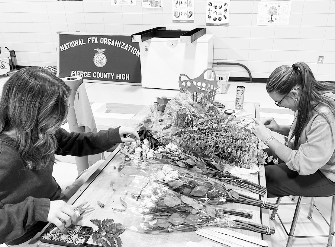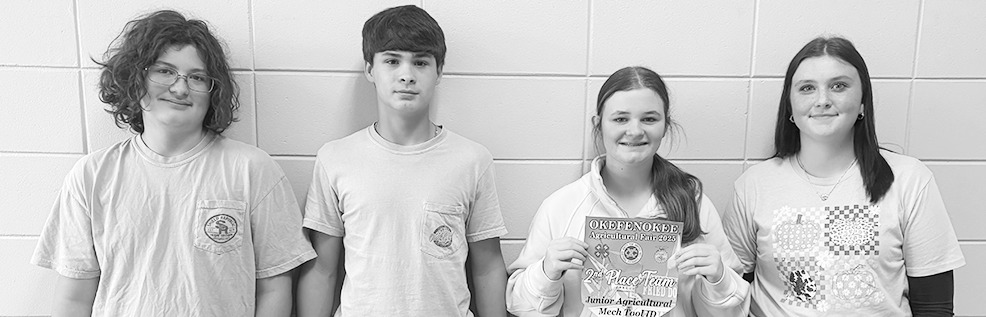Pictured are Thomas Whitley, Easton Kimmons, Benley James and Addison Hoaglan. These students competed as a team at the Okefenokee Agricultural fair and placed second out of all the schools present.Paige Folette, Braelyn Ralph, Allison Denison and Kylee King competing at Okefenokee fair Vet science competition.Madie Bowen and Lillie Thornton make floral arrangements for night to shine.Gabby Herrin, Parker Sinclair and Brittany Prescott are pictured here with JT Taylor at Night to Shine. This is a community event for individuals with special circumstances to participate in prom.