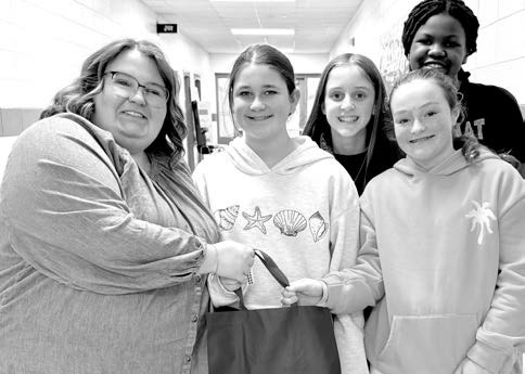 Teacher KatieBeth Smith (left) gets her bag of supplies from Leeria Moody, Charlee Cravey, Janiyah Keyhea and Annabelle Carver.
