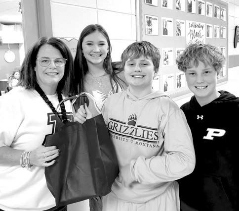 Teacher Alyson Roberson (left) receives her bag of supplies from Daisy Belmondo, Eason Mays and Jacob Cravey.