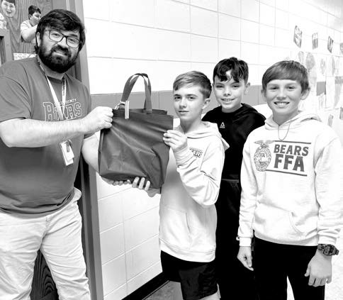 Teacher Chris Hiers (left) gets his bag of school supplies from Brandt Wood, Bentley Campos and Griffin Walsh.