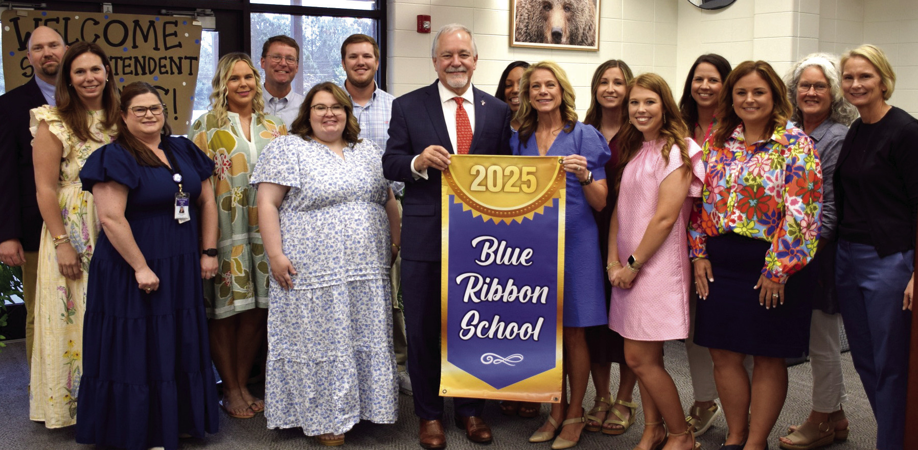 Pierce County Middle School has been named a National Blue Ribbon School for 2025. State School Superintendent Richard Woods and PCMS principal Amanda Gay (holding banner) are shown with members of the middle school faculty.