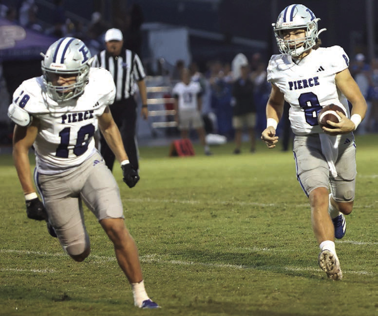 Pierce County quarterback Drake Dowling (8) runs behind the blocking of Noah Delaney (18) during first half action picking up part of his gamehigh 132 yards on 12 carries. Photo By CONNER SELPH