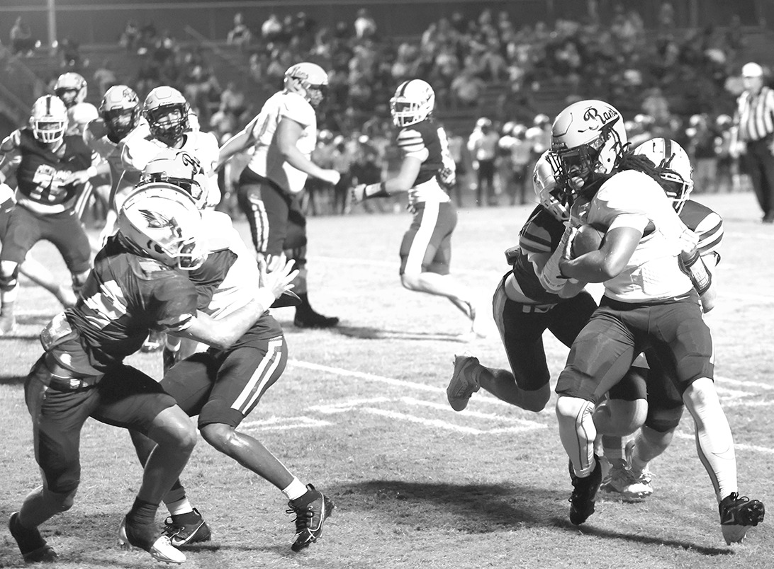 Worth County’s Treshaun Jones is pulled down from behind by Brantley County’s Clark Carter and Zayne Smith inside the Herons’ 10 during first quarter action. Jones finished with 54 yards rushing on six attempts. Photo By CONNOR SELPH