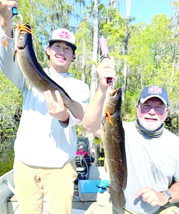 John (right) and Isaiah Bittle fished the Okefenokee Swamp out of SC Foster State Park and caught this double of bowfin on their way to catching 106 fish. SPECIAL PHOTO