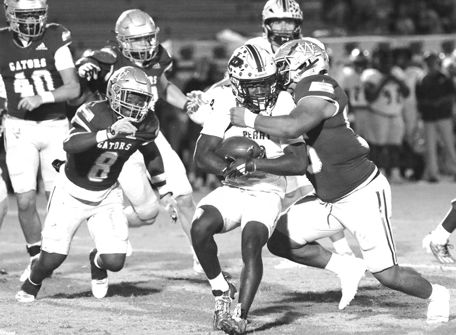 Ware County defensive lineman Nick Grant puts a Perry ball carrier in a bear hug and drives him back during action Friday night. Teammate Jamarion Keyhea (8) closes in. Photo By BO CARTER