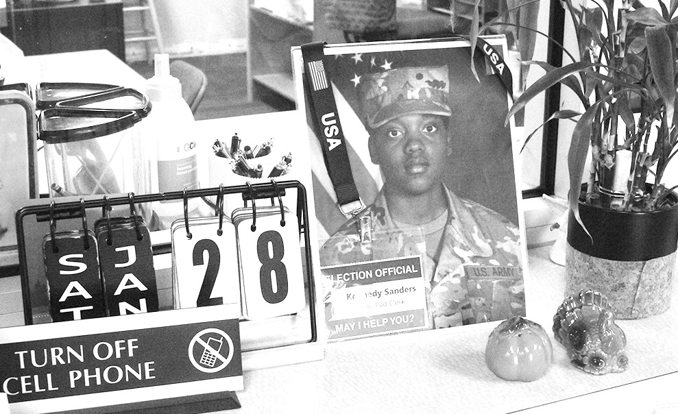 Sanders’ military photo and lanyard holding her Board of Elections identification card have been displayed on the front service counter in the board office since shortly after her death.