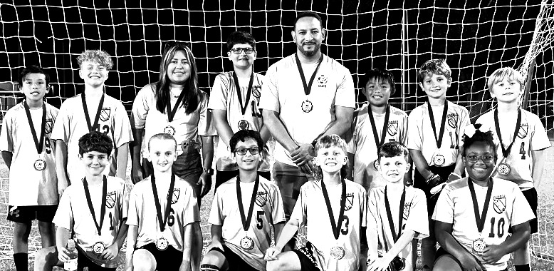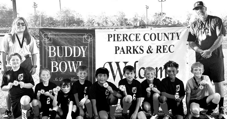 2025 Buddy Bowl 8U Soccer Champs are front row(l-r): Alora Benton Alivia Gholson, Noah Wolfe, Elijah Creamer, Max Cruz, Axton Dixon, Ayden Jernigan, Zayden Williamson and Elliott Johnson. Back row (l-r): Coach Anahi Chaga and Coach Dustin Hodges.