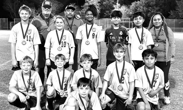2025 Buddy Bowl 10U Soccer Champs are bottom row (l-r): Jaxson Wright, Kinsley Carter, Roberto Lopez, Kellen Zauner, Braxton Zauner and AliRose Gragg. Back row (l-r): Cayden Dixon, Waylon Spivey, Coach Anahi Chaga, Logan Richardson, Coach Roberto Lopez, Matteo Cruz, Jett Strader and Brenton Sweat.