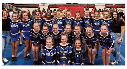 Pierce County Middle School’s competition cheer team captured its eighth consecutive Southeast Georgia Middle School Athletic Conference title Tuesday, November 4 at host Waycross Middle School and 16th in 17 years. PCMS finished with 99 points to easily outdistance runner-up Ware County Middle School’s 71 points. Pictured are (front, l-r) Lilly English, Lucy Duncan, Miley Taylor, (middle, l-r) Karsyn Bennett, Demri Boyett, Addi Dixon, Harper Jordan, Harper Jordan, Stella Smith, Baxlee Riggins, (back, l-r) coach Dde Jordan, Hadley Arington, Lakota Davis, Brooklynn Barber, Logan Peacock, Emmaline Taylor, Chesli Stone, Addison Taylor, Avery Wright, Audrey Boatright and Coach Sydney Tyson.
