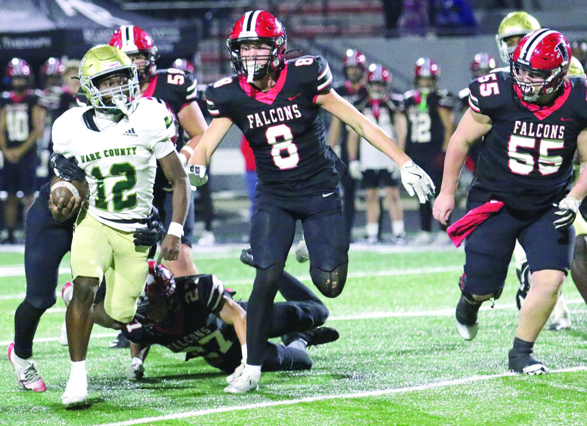 Quarterback Brett Sturm kept the Region 8 runner-up Falcons (7-4) in the game until his late mistake. The senior completed 24-of-40 passes for 310 yards and a touchdown as well as running two scores.