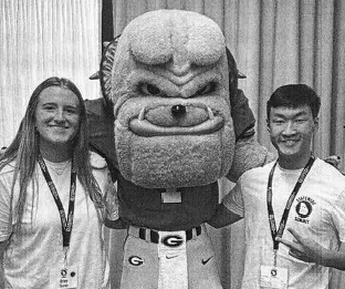 Pausing for a pic with the UGA mascot are (lr) Riley Thomas and Drew Mattox.