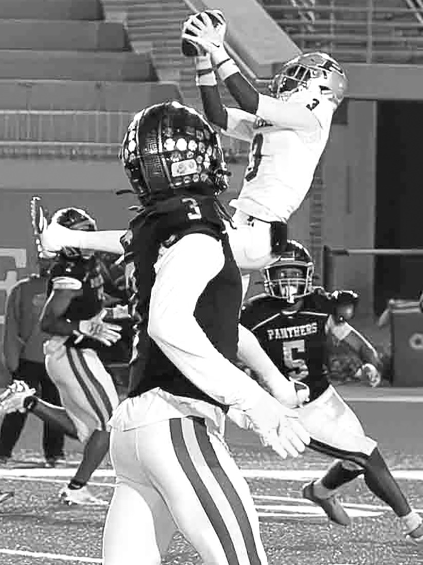 Jae’Veon Williams (top left) outruns a Carver-Columbus defender to the end zone, scoring from nine yards out on fourth down 35 seconds before intermission and pulling PCHS to within 28-21 at intermission. Joe Drew (right photo) goes up high to pull in an interception in the second quarter.