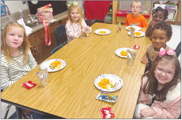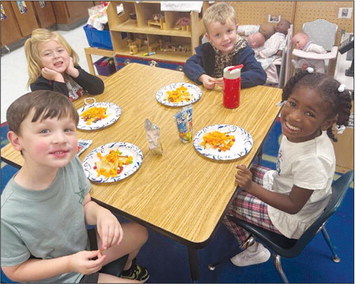 The students in the class of Holly Thomas have enjoyed learning about the first Thanksgiving. In the photo above are Maddie Reagan, Scout Mc-Neal, Hank Wicker, Malaysia Brand, Johnny McGahee, and Freya Farr. In the photo below are Jaxon Brown, Addie Arnold, Huck Dixon, and Kaylace Corbin enjoying their fire building snack.