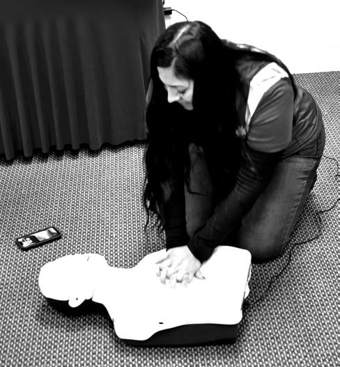 A special practice dummy was employed. Plugged into the wall, a series of lights beneath its plastic “skin” indicated when the proper flow of oxygenated blood was being achieved though hand compressions. The timing of the compression was done to an appropriate tune, “Stayin’ Alive” by the Bee Gees, the tempo of which matches the 100-120 beats per minute needed for successful CPR.
