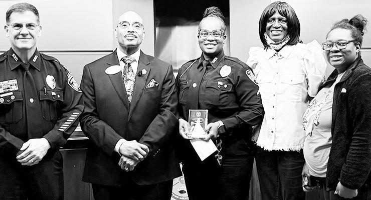 Waycross Police Chief Tommy Cox and Mayor Michael-Angelo James (left) honor Patrol Officer Takira Bledsoe as City Employee of the Month during last week’s commission meeting. At right are Marian Solomon-Gaines and Demetria White. Officer Bledsoe “embodies everything we ask of our officers to be and truly defines professionalism in her daily interactions with both the public and her fellow officers,” Chief Cox said. Photo by RICK NOLTE