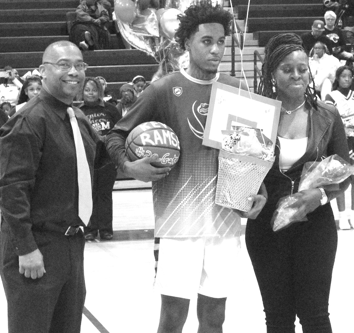 Ware County High School’s basketball programs honored their Class of 2026 seniors during Saturday’s game with Long County. Gators’ head coach Lenny Williams (left photo) stands with Kelvin Ramsey and his mother. Lady Gators’ head coach Mandy Ligenfelter (right photo) helped to recognize Lydia Munford, Bre Hill and Skyy Green.