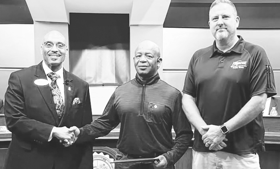 SPECIAL PHOTO City of Waycross Cemetery Superintendent Anthony James was presented Golden Spike No. 40 of 100 during last week’s City Commission meeting. In honoring James, Mayor Michael-Angelo (left) and Public Works Director Matt Elwell (right) said the 43-year city employee consistently goes above and beyond his job duties, serving our community with compassion, professionalism, and care. His dedication helps bring comfort to families during times of bereavement— and long after — making a lasting difference when it matters most.