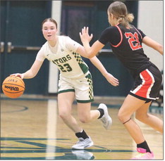 Ware County’s Bailey Denton, bringing the ball up the floor against a Hilliard defender, averaged 14 points in the Lady Gators’ three-game slate last week. Photo By RICK HEAD