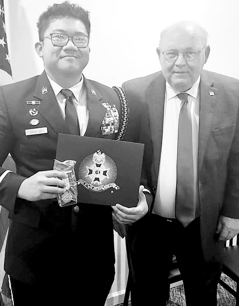 JESUP — Cadet Troy Medcalf recently received the JROTC Bronze Medal for Brantley County High School for the 2025-26 school year. Medcalf was recognized for his leadership qualities, military bearing and general excellence. The award presentation took place recently at the Altamaha Chapter's quarterly meeting at Family Traditions Restaurant in Jesup. Medcalf is shown with Judge Franklin Rozier Jr., president of the Altamaha Chapter SAR.